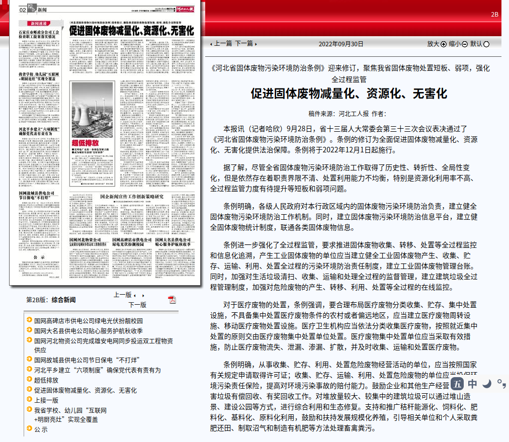 河北工人报 :促进固体废物减量化、资源化、无害化 《河北省固体废物污染环境防治条例》迎来修订,聚焦我省固体废物处置短板、弱项,强化全过程监管 来源:河北工人报 时间:2022-09-30