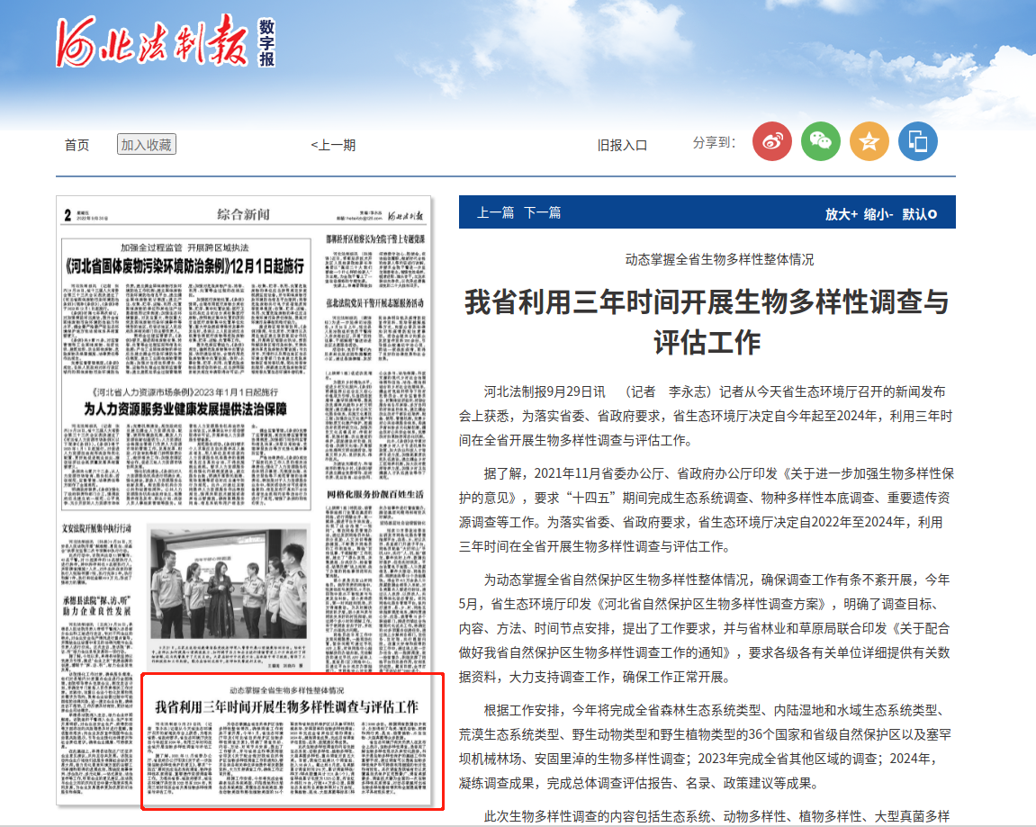 据了解,2021年11月省委办公厅、省政府办公厅印发《关于进一步加强生物多样性保护的意见》,要求“十四五”期间完成生态系统调查、物种多样性本底调查、重要遗传资源调查等工作。为落实省委、省政府要求,东京热 决定自2022年至2024年,利用三年时间在全省开展生物多样性调查与评估工作。