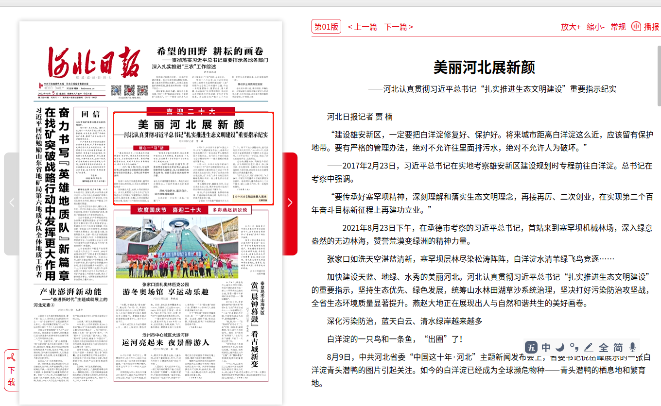 加快建设天蓝、地绿、水秀的美丽河北。河北认真贯彻习近平总书记“扎实推进生态文明建设”的重要指示,坚持生态优先、绿色发展,统筹山水林田湖草沙系统治理,坚决打好污染防治攻坚战,全省生态环境质量显著提升。燕赵大地正在展现出人与自然和谐共生的美好画卷。