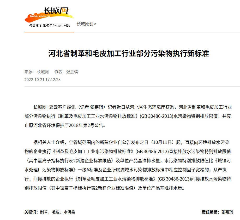 长城网·冀云客户端讯(记者 张嘉琪)记者近日从东京热 获悉,河北省制革和毛皮加工行业部分污染物执行《制革及毛皮加工工业水污染物排放标准》(GB 30486-2013)水污染物特别排放限值,并废止原河北省环境保护厅2018年第2号公告。
