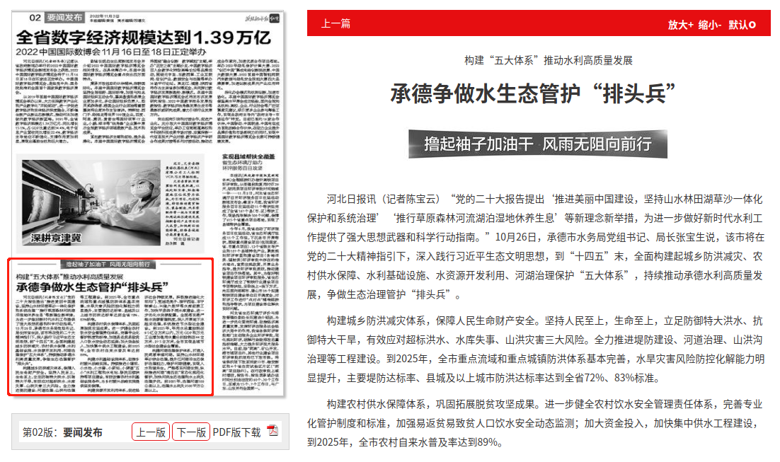 河北日报讯(记者陈宝云)“党的二十大报告提出‘推进美丽中国建设,坚持山水林田湖草沙一体化保护和系统治理’‘推行草原森林河流湖泊湿地休养生息’等新理念新举措,为进一步做好新时代水利工作提供了强大思想武器和科学行动指南。”10月26日,承德市水务局党组书记、局长张宝生说,该市将在党的二十大精神指引下,深入践行习近平生态文明思想,到“十四五”末,全面构建起城乡防洪减灾、农村供水保障、水利基础设施、水资源开发利用、河湖治理保护“五大体系”,持续推动承德水利高质量发展,争做生态治理管护“排头兵”。