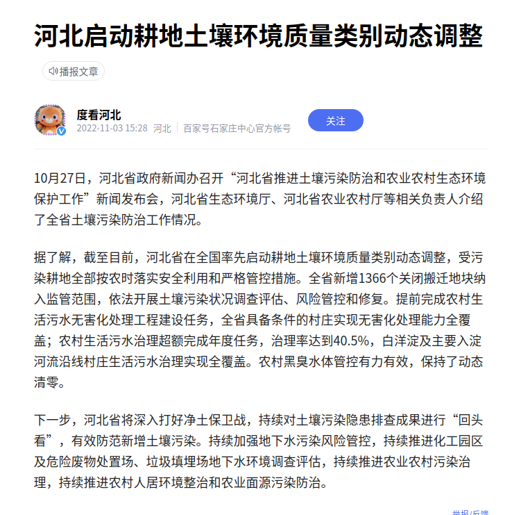 百度新闻:河北启动耕地土壤环境质量类别动态调整