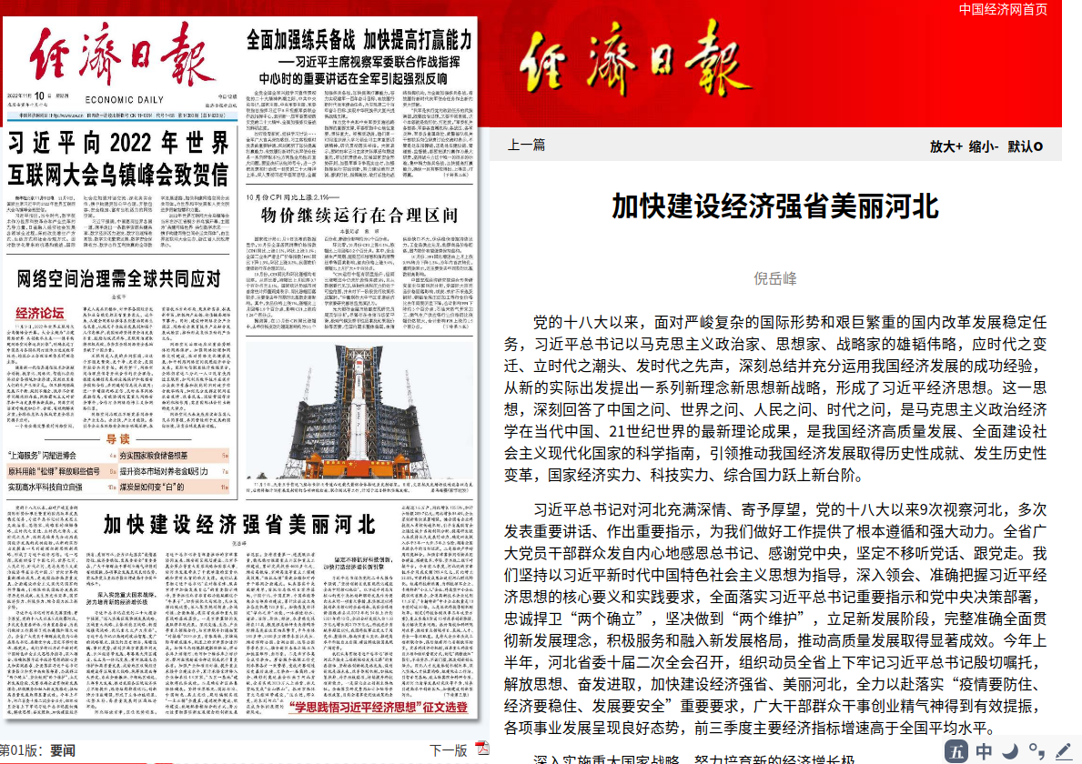 习近平总书记对河北充满深情、寄予厚望,党的十八大以来9次视察河北,多次发表重要讲话、作出重要指示,为我们做好工作提供了根本遵循和强大动力。全省广大党员干部群众发自内心地感恩总书记、感谢党中央,坚定不移听党话、跟党走。我们坚持以习近平新时代中国特色社会主义思想为指导,深入领会、准确把握习近平经济思想的核心要义和实践要求,全面落实习近平总书记重要指示和党中央决策部署,忠诚捍卫“两个确立”,坚决做到“两个维护”,立足新发展阶段,完整准确全面贯彻新发展理念,积极服务和融入新发展格局,推动高质量发展取得显著成效。今年上半年,河北省委十届二次全会召开,组织动员全省上下牢记习近平总书记殷切嘱托,解放思想、奋发进取,加快建设经济强省、美丽河北,全力以赴落实“疫情要防住、经济要稳住、发展要安全”重要要求,广大干部群众干事创业精气神得到有效提振,各项事业发展呈现良好态势,前三季度主要经济指标增速高于全国平均水平。