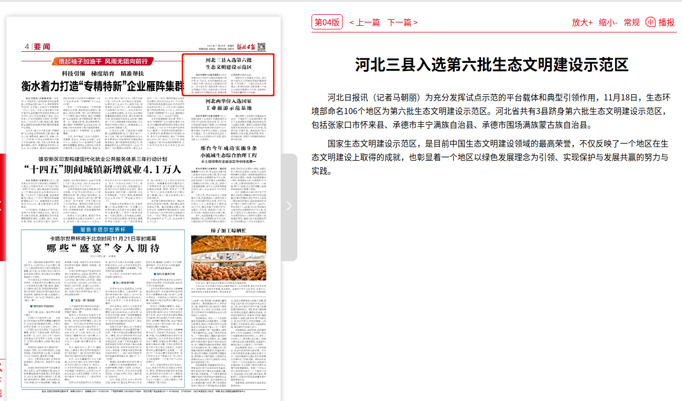 河北日报:河北三县入选第六批生态文明建设示范区 来源:河北日报 时间:2022-11-20