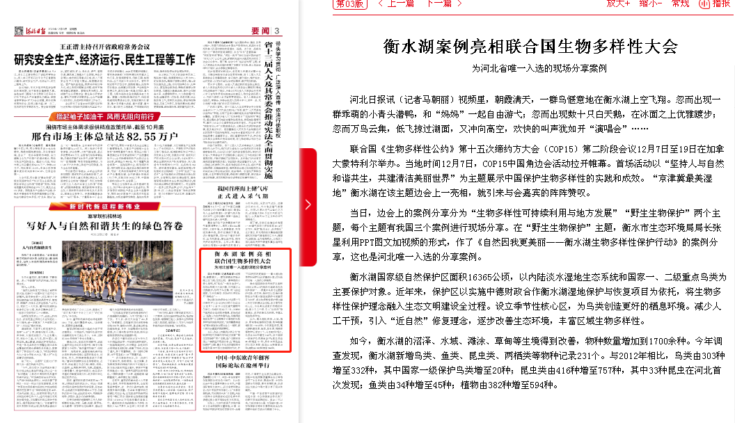 河北日报:衡水湖案例亮相联合国生物多样性大会 为河北省唯一入选的现场分享案例