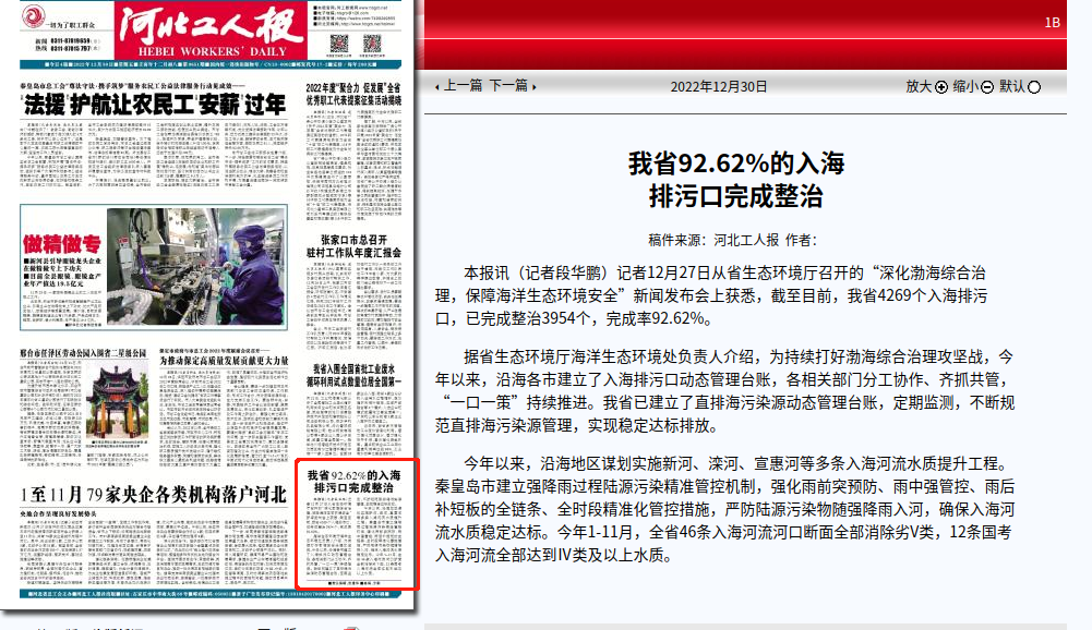 河北工人报:我省92.62%的入海排污口完成整治