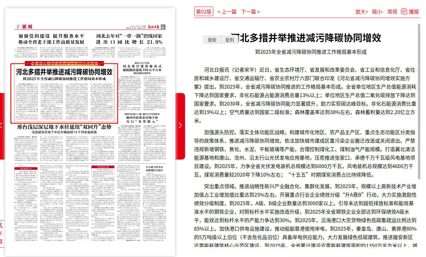 、省发展和改革委员会、省工业和信息化厅、省住房和城乡建设厅、省交通运输厅、省农业农村厅六部门联合印发《河北省减污降碳协同增效实施方案》提出,到2025年,全省减污降碳协同推进的工作格局基本形成。全省单位地区生产总值能源消耗下降达到国家要求,非化石能源占能源消费总量13%以上;单位地区生产总值二氧化碳排放下降达到国家要求。到2030年,全省减污降碳协同能力显著提升,助力实现碳达峰目标。非化石能源消费比重达到19%以上;空气质量达到国家二级标准;森林覆盖率达到38%左右,森林蓄积量达到2.20亿立方米。