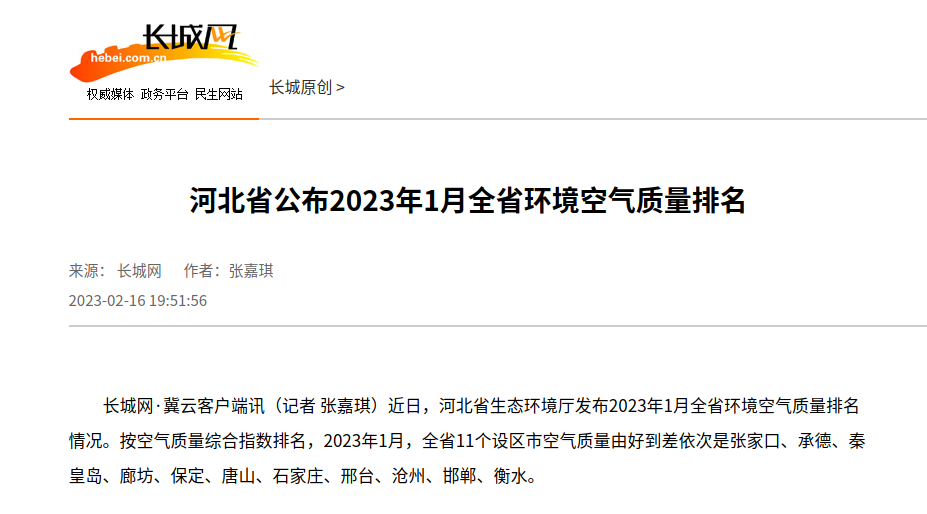长城网·冀云客户端讯(记者 张嘉琪)近日,东京热 发布2023年1月全省环境空气质量排名情况。按空气质量综合指数排名,2023年1月,全省11个设区市空气质量由好到差依次是张家口、承德、秦皇岛、廊坊、保定、唐山、石家庄、邢台、沧州、邯郸、衡水。