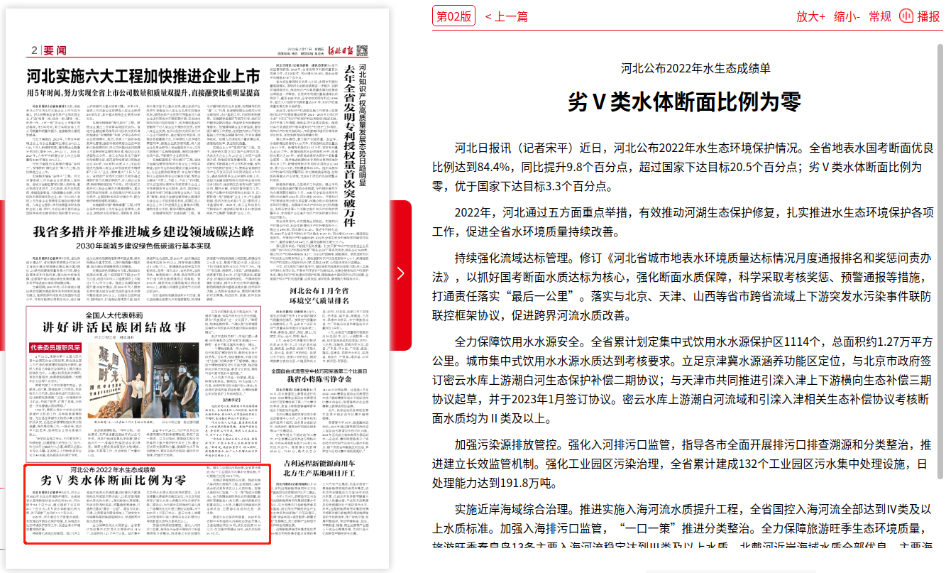 河北日报:河北公布2022年水生态成绩单 劣Ⅴ类水体断面比例为零