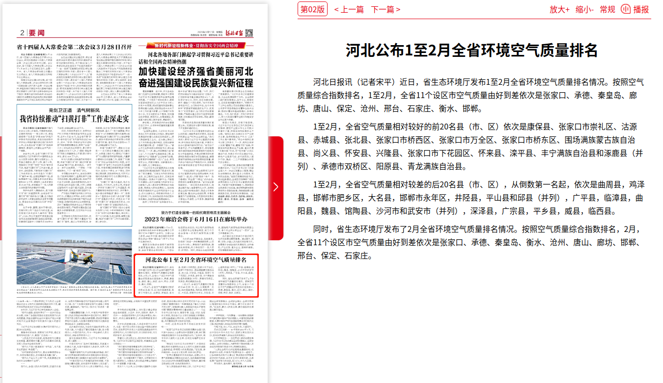 河北日报:河北公布1至2月全省环境空气质量排名