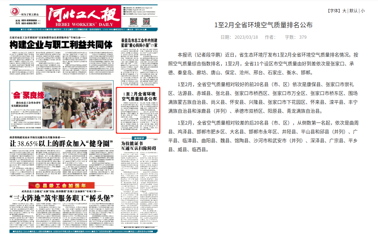 1至2月,全省空气质量相对较差的后20名县(市、区),从倒数第一名起,依次是曲周县、鸡泽县、邯郸市肥乡区、大名县、邯郸市永年区、井陉县、平山县和邱县(并列)、广平县、临漳县、曲阳县、魏县、馆陶县、沙河市和武安市(并列)、深泽县、广宗县、平乡县、威县、临西县。