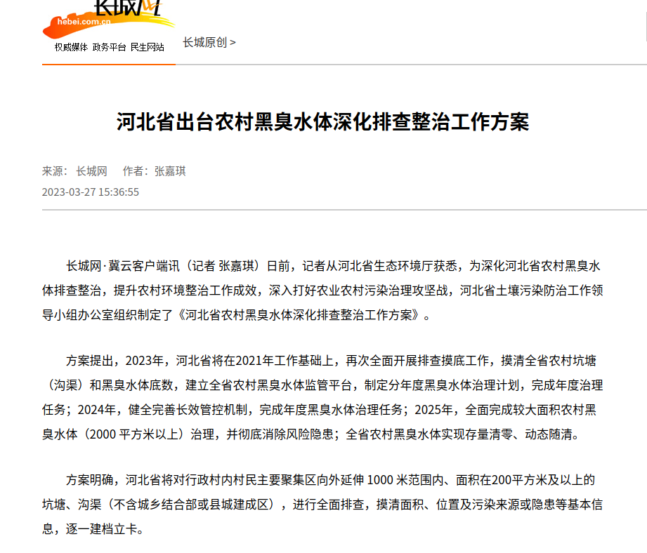 方案提出,2023年,河北省将在2021年工作基础上,再次全面开展排查摸底工作,摸清全省农村坑塘(沟渠)和黑臭水体底数,建立全省农村黑臭水体监管平台,制订分年度黑臭水体治理计划,完成年度治理任务;2024年,健全完善长效管控机制,完成年度黑臭水体治理任务;2025年,全面完成较大面积农村黑臭水体(2000 平方米以上)治理,并彻底消除风险隐患;全省农村黑臭水体实现存量清零、动态随清。