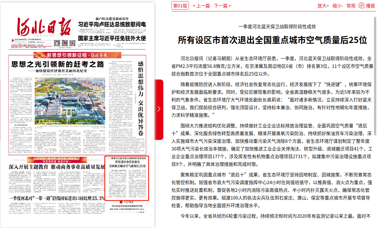河北日报:一季度河北蓝天保卫战取得阶段性成效 所有设区市首次退出全国重点城市空气质量后25位