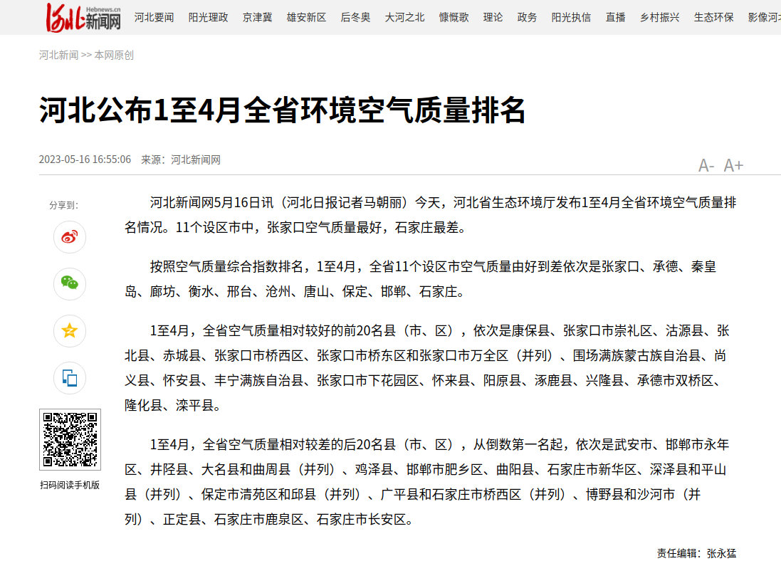河北新闻网 :河北公布1至4月全省环境空气质量排名