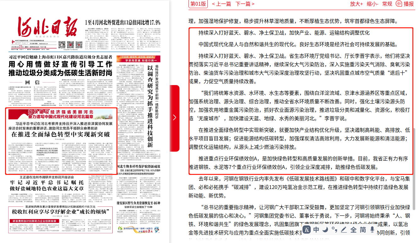 河北日报:习近平总书记在河北考察并主持召开深入推进京津冀协同发展座谈会时发表的重要讲话,激励河北党员干部群众奋勇前进 在推进全面绿色转型中实现新突破