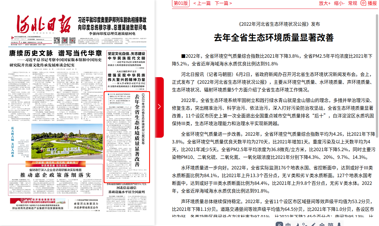 河北日报:《2022年河北省生态环境状况公报》发布 去年全省生态环境质量显著改善