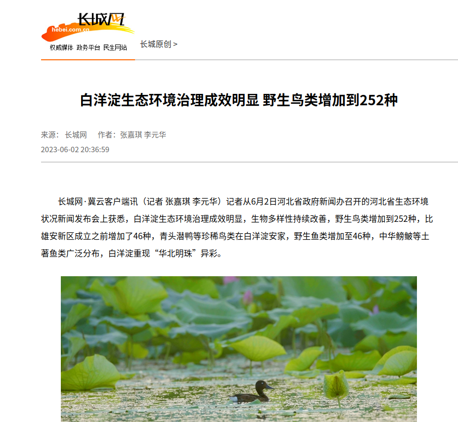 长城网·冀云客户端讯(记者 张嘉琪 李元华)记者从6月2日河北省政府新闻办召开的河北省生态环境状况新闻发布会上获悉,白洋淀生态环境治理成效明显,生物多样性持续改善,野生鸟类增加到252种,比雄安新区成立之前增加了46种,青头潜鸭等珍稀鸟类在白洋淀安家,野生鱼类增加至46种,中华鳑鲏等土著鱼类广泛分布,白洋淀重现“华北明珠”异彩。