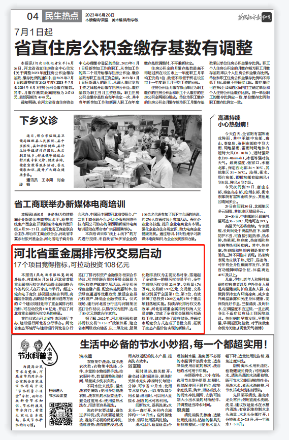 燕赵都市报:河北省重金属排污权交易启动:17个项目竞得指标,可拉动投资108亿元