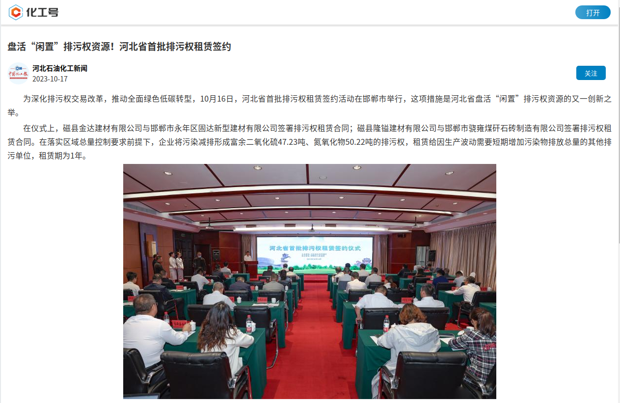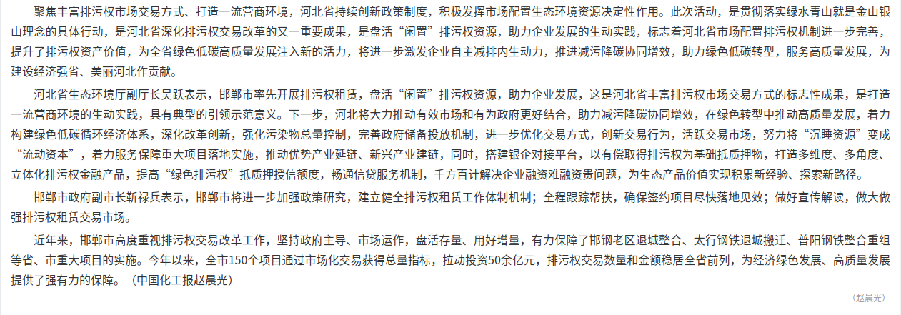 中国化工报:盘活“闲置”排污权资源!河北省首批排污权租赁签约