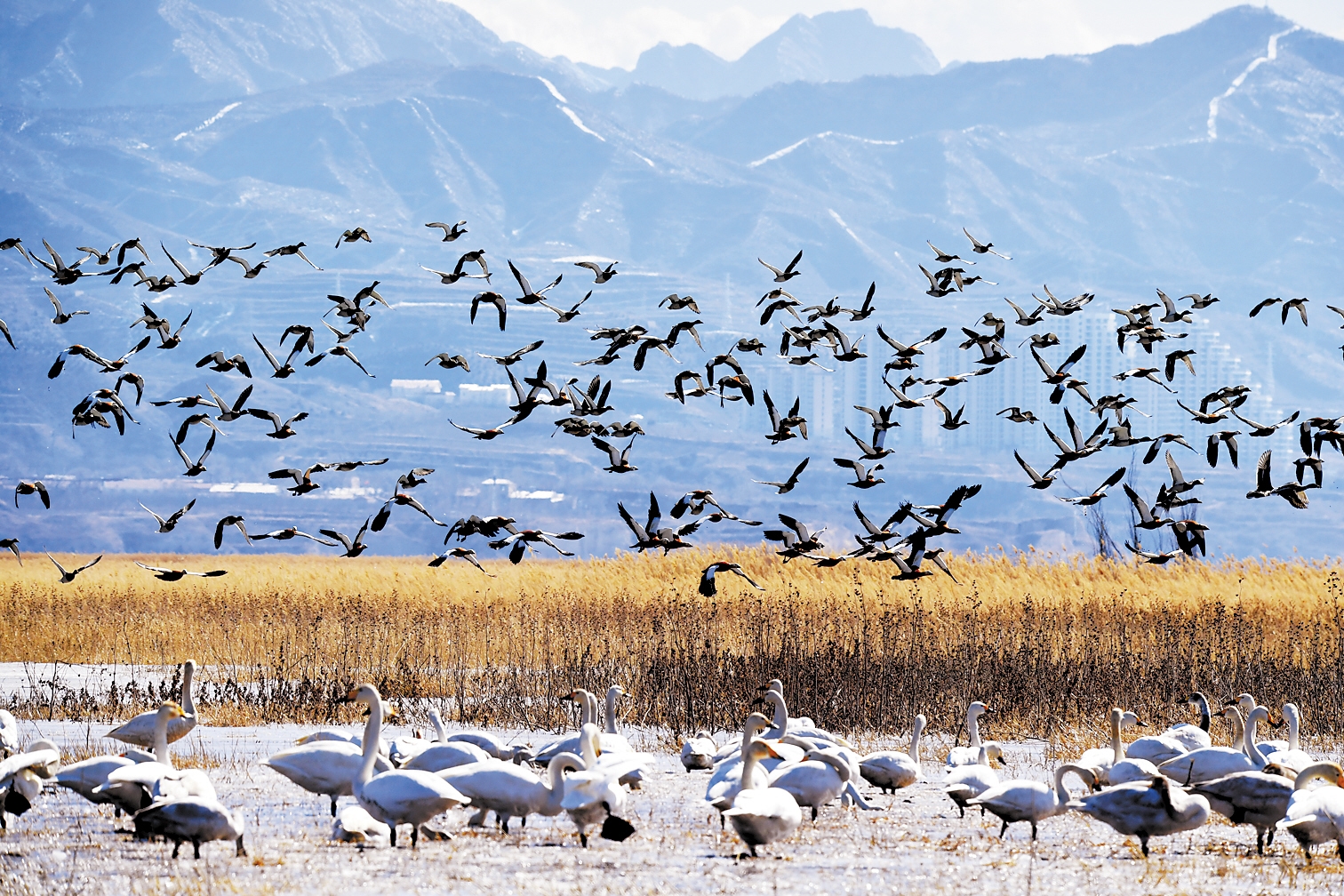 官厅水库是永定河上最大的水库,永定河从官厅水库向下流向北京。近年来,张家口加快推动湿地公园建设,不断修复水库生态系统,目前入库水质已由之前的地表水Ⅳ类提升为Ⅲ类,“飞鸟成云”经常可见。