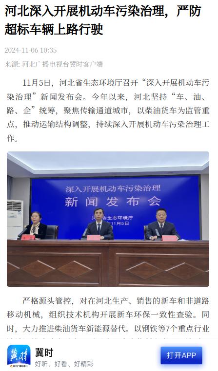 召开“深入开展机动车污染治理”新闻发布会。今年以来,河北坚持“车、油、路、企”统筹,聚焦传输通道城市,以柴油货车为监管重点,推动运输结构调整,持续深入开展机动车污染治理工作。