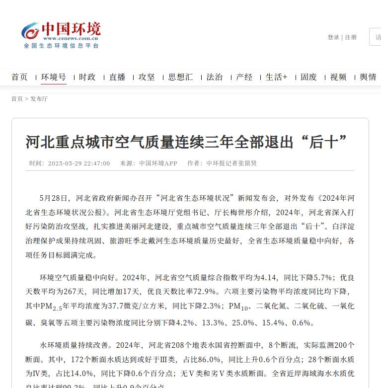 中国环境客户端:河北重点城市空气质量连续三年全部退出“后十”