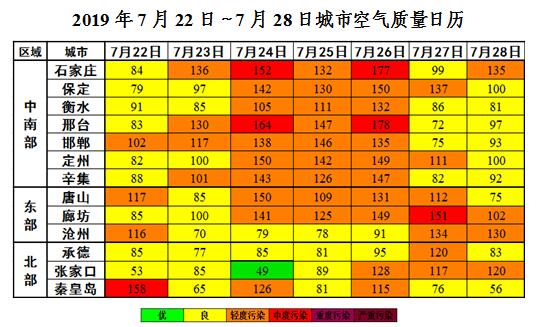 上周(2019年7月22日~7月28日),受高温天气持续影响,扩散条件整体一般,我省大部地区空气质量以良至轻度污染为主,个别城市出现中度污染,首要污染物以O3为主。