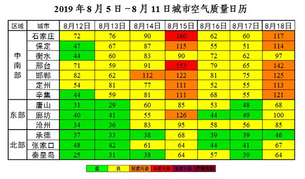 上周(2019年8月12日~8月18日),受区域性降水过程及北风影响,扩散条件总体有利,我省大部以优良为主;期间15日和18日,地面受南风影响,扩散条件一般,全省大部以良至轻度污染为主,首要污染物为O3。石家庄、邢台各出现1天中度污染。
