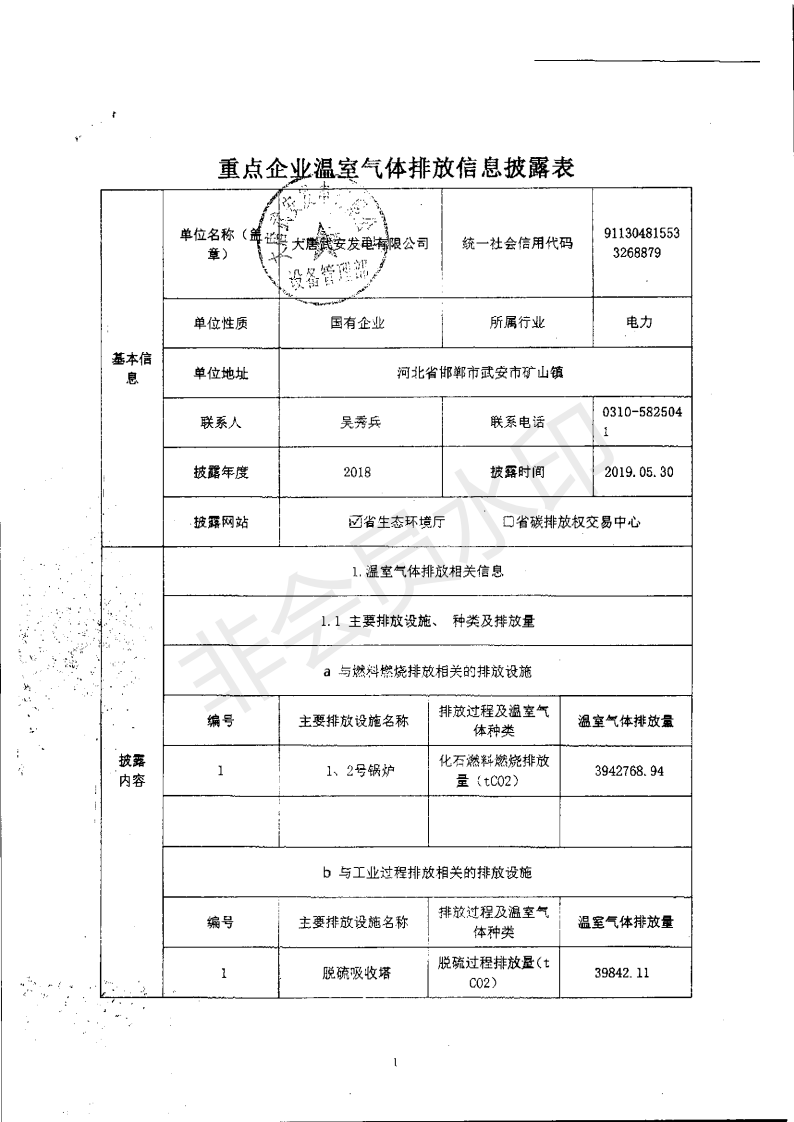 大唐武安发电有限公司重点企业温室气体排放信息披露表