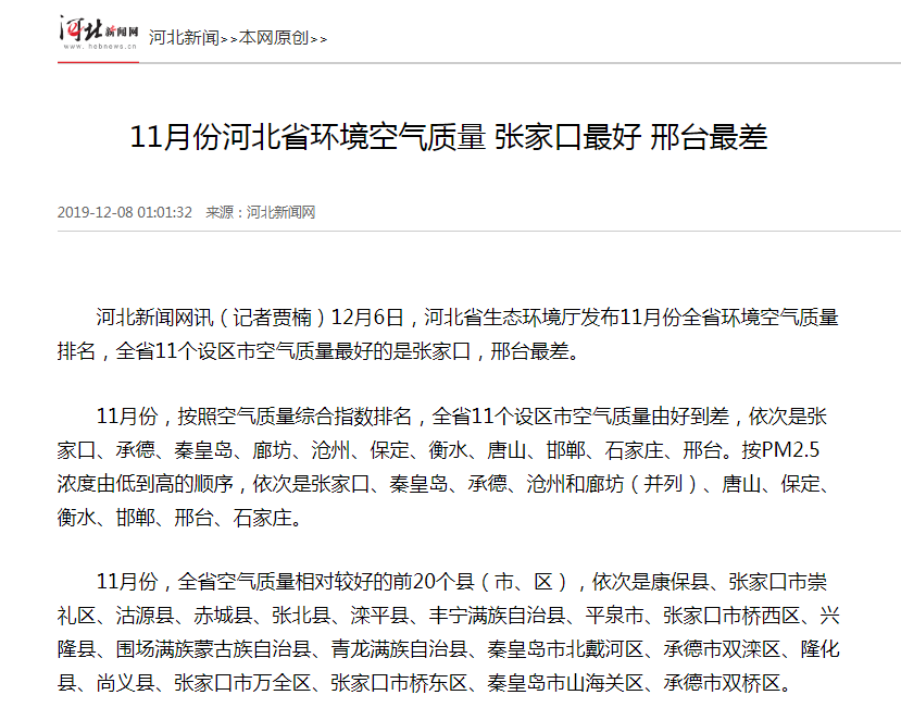 11月份,按照空气质量综合指数排名,全省11个设区市空气质量由好到差,依次是张家口、承德、秦皇岛、廊坊、沧州、保定、衡水、唐山、邯郸、石家庄、邢台。按PM2.5浓度由低到高的顺序,依次是张家口、秦皇岛、承德、沧州和廊坊(并列)、唐山、保定、衡水、邯郸、邢台、石家庄。